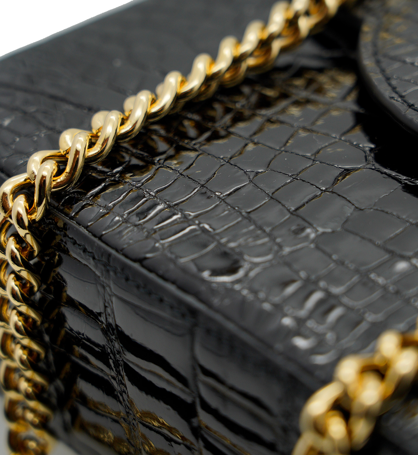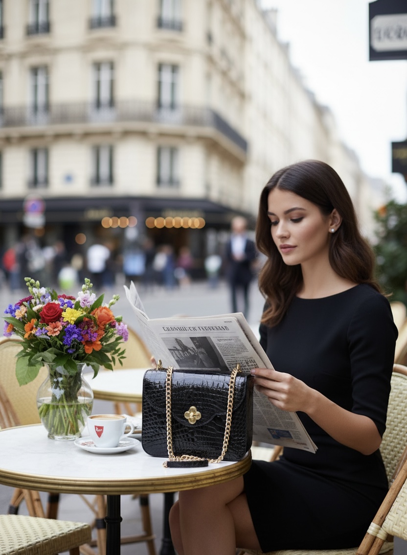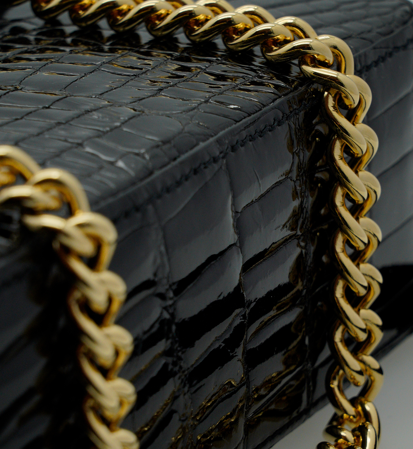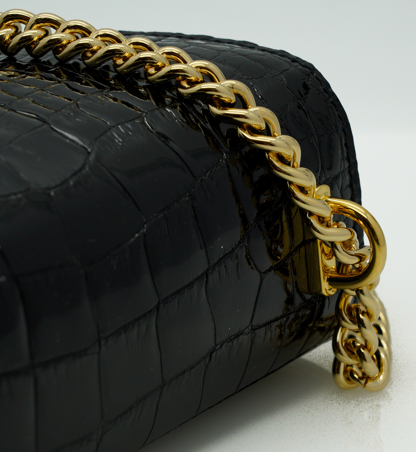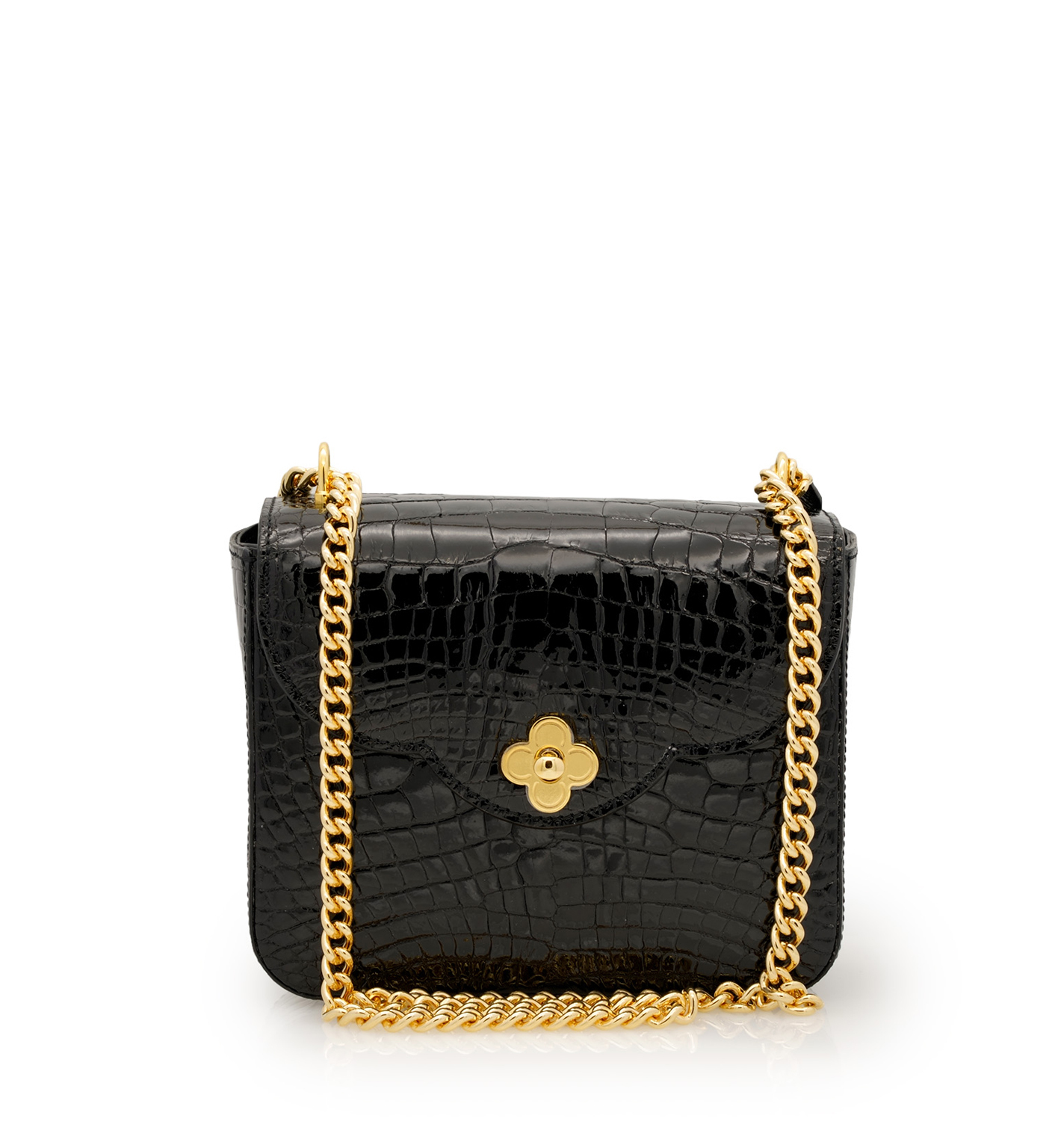 Cardinal iconic ‘First Date’ small bag is designed for a metropolitan lady to wear it cross seasons in a variety of occasions. That’s why a clean shape and lines are unconditional for such a versatile accessory. First date shoulder bag has been realized in Milan. It is handcrafted from shiny GENUINE Alligator leather in timeless and classic elegant black color and embellished with a twist-flower brand logo in chic golden hardware. This bag has a modern architectural feel thanks to a trefoil flap – characteristic detail of Milan gothic architecture. Such a chic accessory will make a lady more confident on her first date, romantic dinner and can be a perfect accessory for her city walks and meeting with friends. The bag is roomy enough for an Iphone, cards, keys and make up essentials.The bag has a chain-leather strap to dress it cross body or on shoulder.