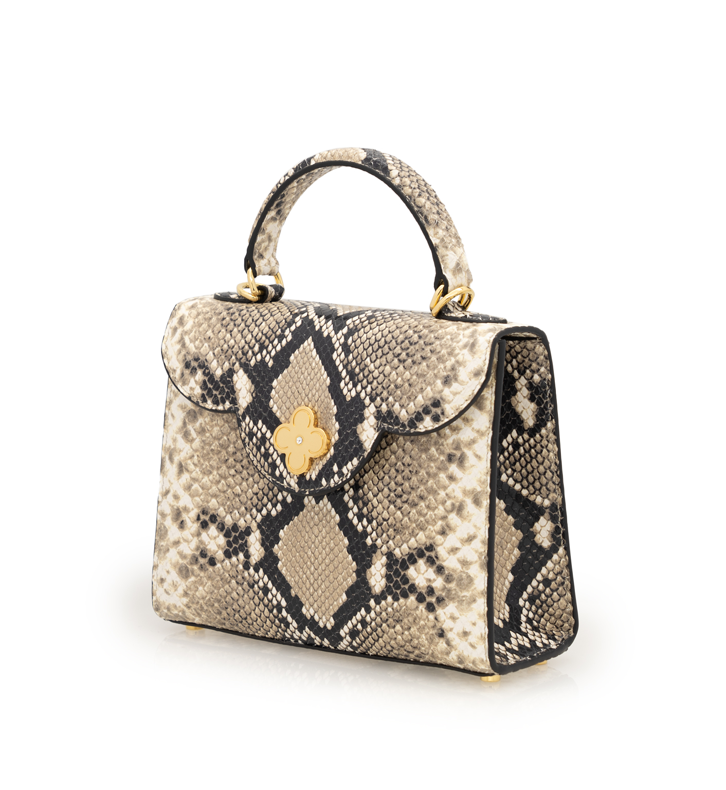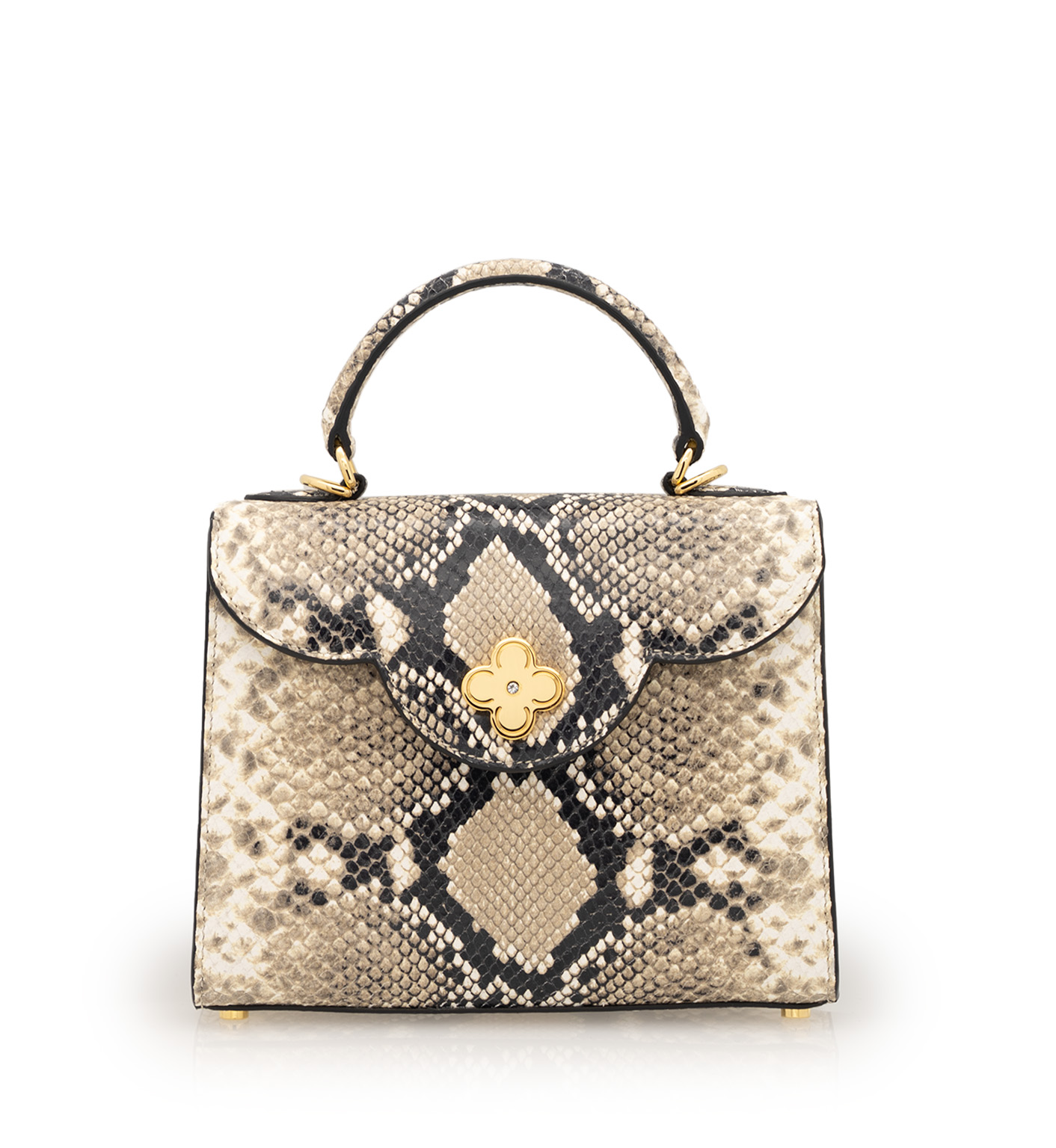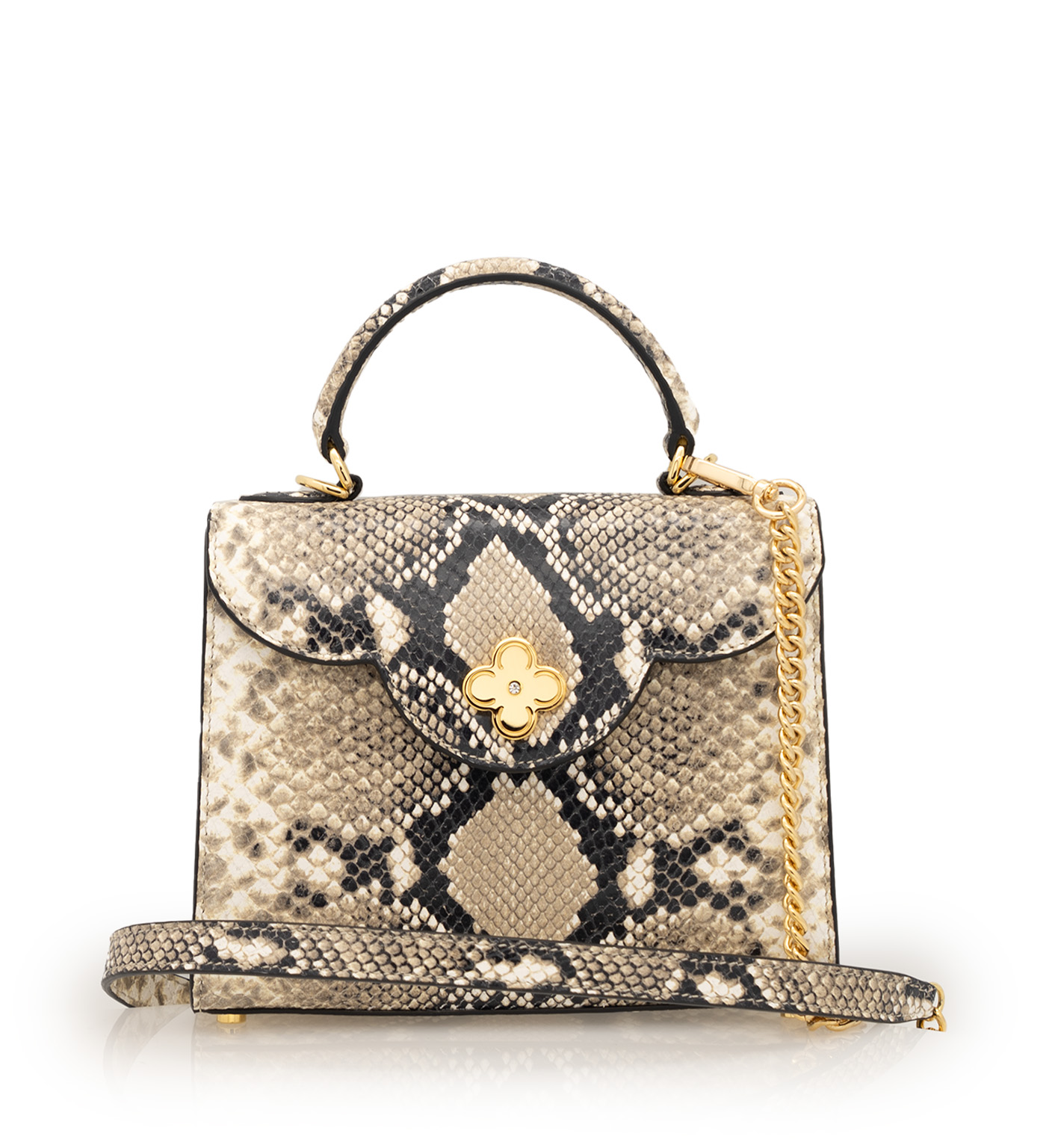 Cardinal signature “First Lady small” top handle bag is perfect accessory to wear cross seasons. This bag is perfect for daily use, romantic meetings or meeting with friends. This timeless bag has been made in Milan by experted artisans in clean elegant shape. It is handcrafted from smooth leather stone shadow color with, detailed with a flower logo in gold hardware embellished with rhinestone. The top handle is comfortable for hand or elbow carry and a removable chain for over-the-shoulder wear. The bag is roomy enough for your essentials like small wallet, phone, keys and make up. A magnetic closure keeps your essentials safe, there is one internal pocket. This chic accessory will make a lady look more cute but so elegant at the same time.