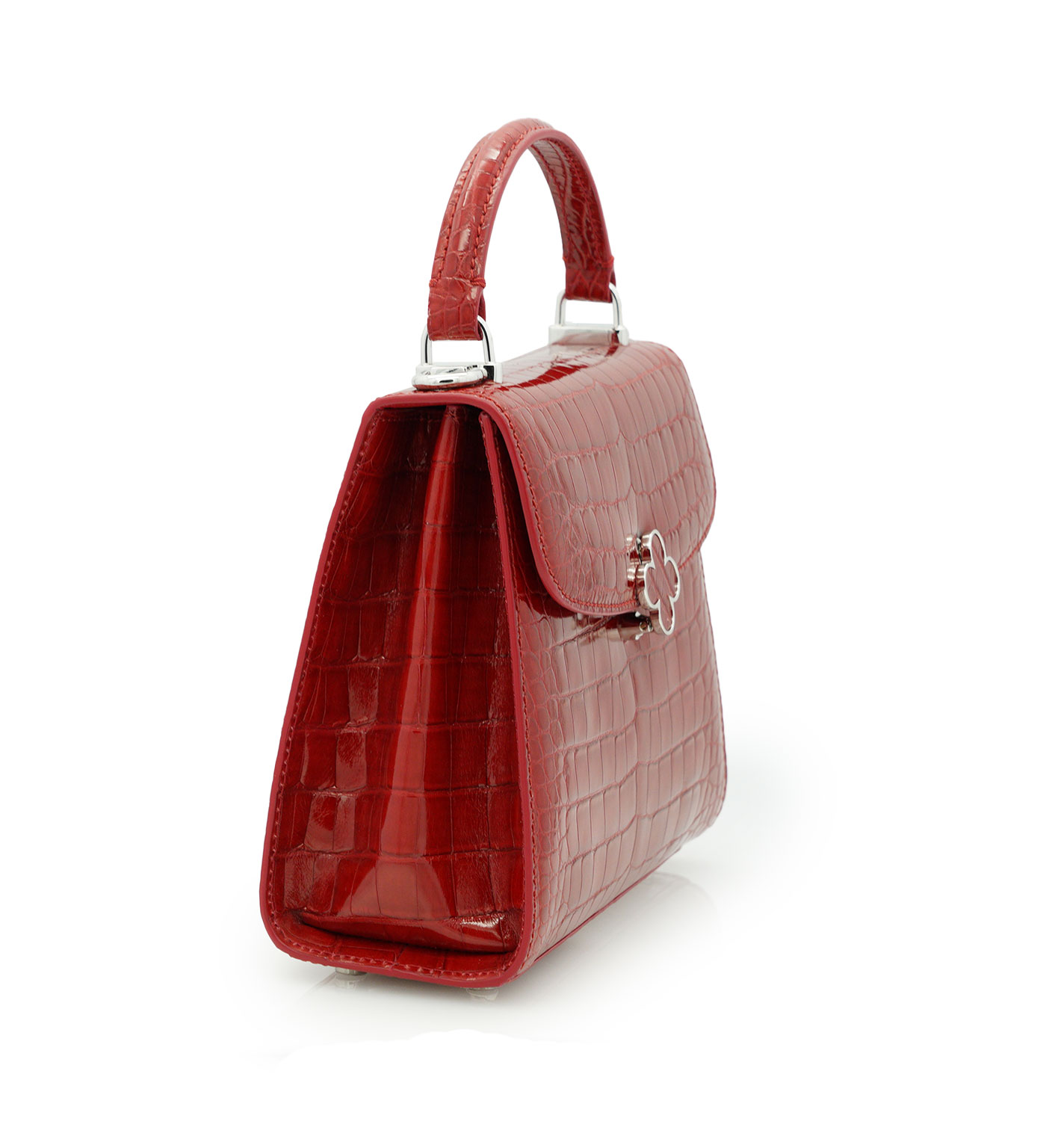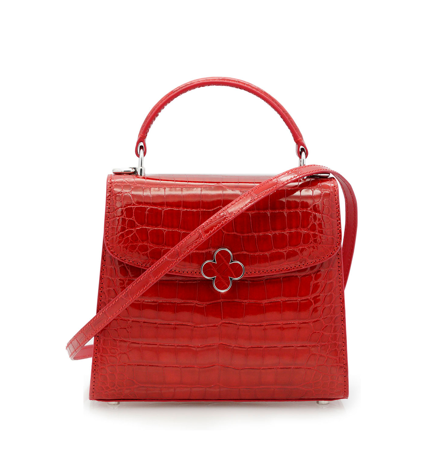 Cardinal signature “Tiffany” top handle bag is perfect accessory to wear cross seasons. This timeless bag has been made in Milano by experted artisans in clean elegant shape. It is handcrafted from genuine alligator leather in red color, detailed with Cardinal brand identity flower lock . The top handle is comfortable for hand or elbow carry and a removable strap for over-the-shoulder wear. The bag is in mini size but roomy enough for your essentials like small wallet, keys and make up. A special Cardinal clip-flower look keeps your essentials safe, there is one internal pocket. This chic accessory will make a lady look more cute and elegant at the same time.