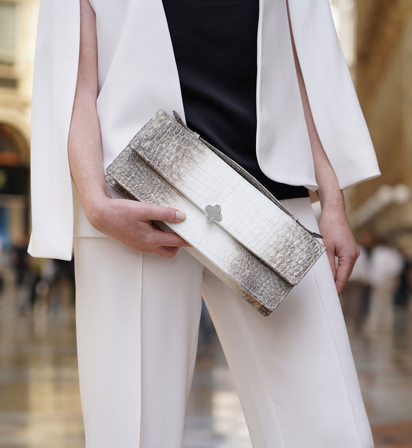 Cardinal Time 22 clutch is ideally sized for parties or dinners when all you need to carry is the essentials. This beautiful bag has been made in Milano, Italy from croc embossed leather in luxurious himalaya white color, it’s detailed with brand recognizable logo lucky clover in white gold version and embellished with jewelry chain.